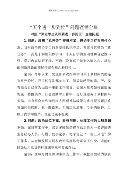 【七哥公文】2025年:【七哥公文】对照“五个进一步到位”问题查摆清单4100字(含问题、案例,精神学习教育问题参考)+更多免费公文+VX:QiGeGongWen2024+更多免费公文+VX:QiGeGongWen2024