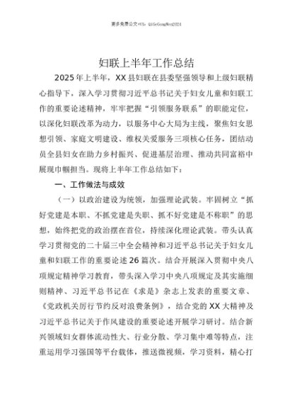 【七哥公文】2025年:【七哥公文】妇联上半年工作总结+更多免费公文+VX:QiGeGongWen2024+更多免费公文+VX:QiGeGongWen2024