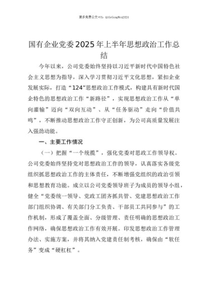 【七哥公文】2025年:【七哥公文】国有企业党委2025年上半年思想政治工作总结+更多免费公文+VX:QiGeGongWen2024+更多免费公文+VX:QiGeGongWen2024