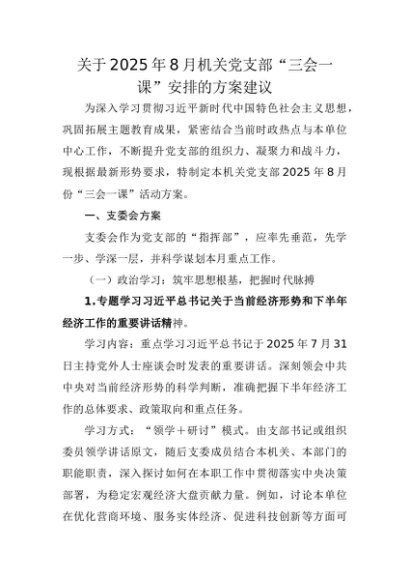 【七哥公文】2025年:【七哥公文】关于2025年8月机关党支部“三会一课”安排的方案建议+更多免费公文+VX:QiGeGongWen2024+更多免费公文+VX:QiGeGongWen2024
