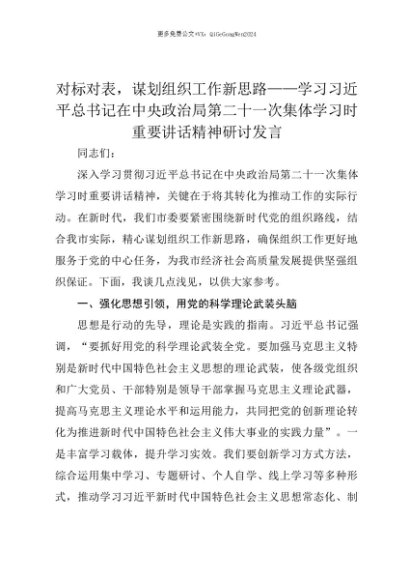 【七哥公文】2025年:【七哥公文】对标对表,谋划组织工作新思路——学习习近平总书记在中央政治局第二十一次集体学习时重要讲话精神研讨发言+更多免费公文+VX:QiGeGongWen2024+更多免费公文+VX:QiGeGongWen2024