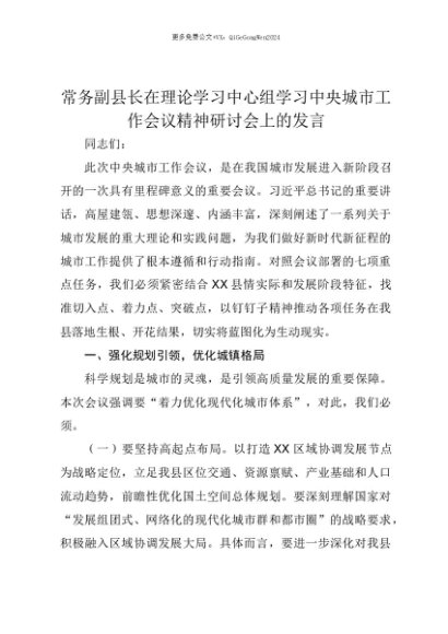 【七哥公文】2025年:【七哥公文】常务副县长在理论学习中心组学习中央城市工作会议精神研讨会上的发言+更多免费公文+VX:QiGeGongWen2024+更多免费公文+VX:QiGeGongWen2024