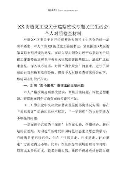 【七哥公文】2025年:【七哥公文】XX街道党工委关于巡察整改专题民主生活会个人对照检查材料(四个聚焦)+更多免费公文+VX:QiGeGongWen2024+更多免费公文+VX:QiGeGongWen2024