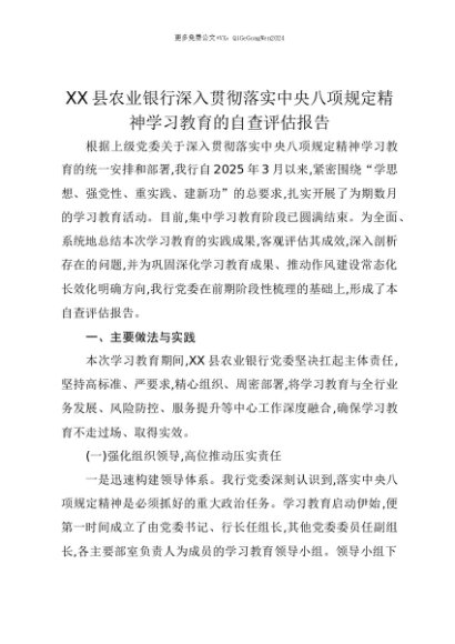 【七哥公文】2025年:【七哥公文】XX县农业银行深入贯彻落实中央八项规定精神学习教育的自查评估报告+更多免费公文+VX:QiGeGongWen2024+更多免费公文+VX:QiGeGongWen2024