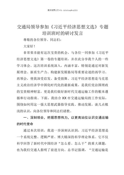 【七哥公文】2025年:【七哥公文】交通局领导参加《习近平经济思想文选》专题培训班时的研讨发言+更多免费公文+VX:QiGeGongWen2024+更多免费公文+VX:QiGeGongWen2024