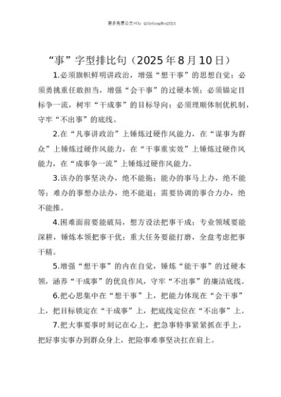 【七哥公文】2025年:【七哥公文】“事”字型排比句(2025年8月10日)+更多免费公文+VX:QiGeGongWen2024+更多免费公文+VX:QiGeGongWen2024