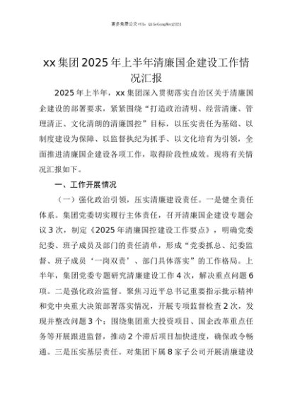 【七哥公文】2025年:【七哥公文】xx集团2025年上半年清廉国企建设工作情况汇报+更多免费公文+VX:QiGeGongWen2024+更多免费公文+VX:QiGeGongWen2024