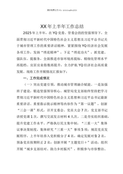 【七哥公文】2025年:【七哥公文】XX市XX区城管局某年上半年工作开展情况总结报告+更多免费公文+VX:QiGeGongWen2024+更多免费公文+VX:QiGeGongWen2024