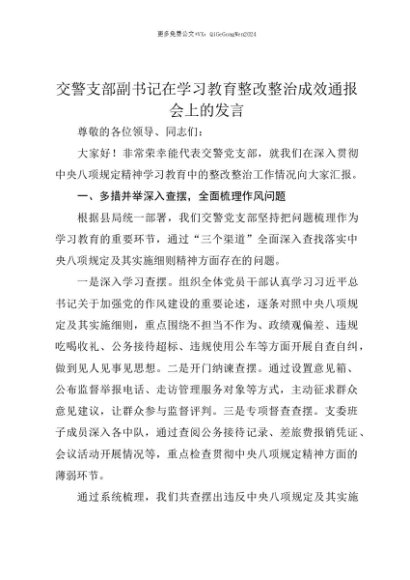 【七哥公文】2025年:【七哥公文】交警支部副书记在贯彻中央八项规定精神学习教育整改整治成效通报会上的发言+更多免费公文+VX:QiGeGongWen2024+更多免费公文+VX:QiGeGongWen2024