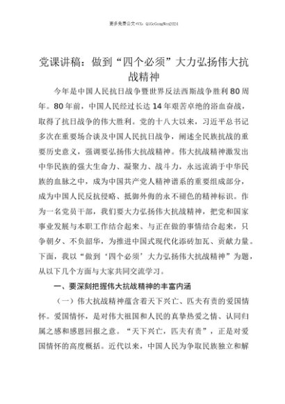 【七哥公文】2025年:【七哥公文】党课讲稿:做到“四个必须” 大力弘扬伟大抗战精神+更多免费公文+VX:QiGeGongWen2024+更多免费公文+VX:QiGeGongWen2024