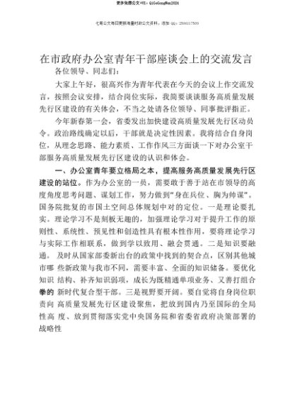 【七哥公文】2025年:【七哥公文】在市政府办公室青年干部座谈会上的交流发言+更多免费公文+VX:QiGeGongWen2024+更多免费公文+VX:QiGeGongWen2024