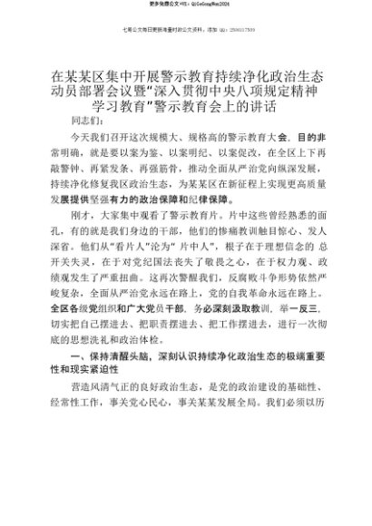 【七哥公文】2025年:【七哥公文】在某某区集中开展警示教育持续净化政治生态动员部署会议暨“深入贯彻中央八项规定精神学习教育”警示教育会上的讲话+更多免费公文+VX:QiGeGongWen2024+更多免费公文+VX:QiGeGongWen2024
