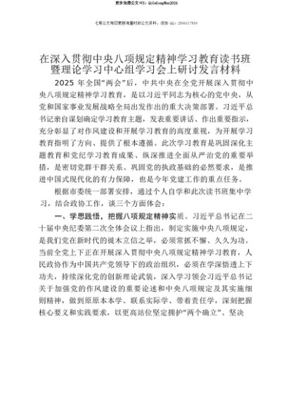 【七哥公文】2025年:【七哥公文】在深入贯彻中央八项规定精神学习教育读书班暨理论学习中心组学习会上研讨发言材料+更多免费公文+VX:QiGeGongWen2024+更多免费公文+VX:QiGeGongWen2024