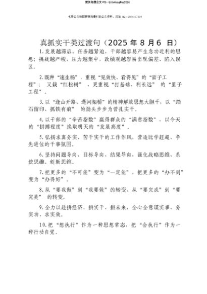 【七哥公文】2025年:【七哥公文】真抓实干类过渡句(2025年8月6日)+更多免费公文+VX:QiGeGongWen2024+更多免费公文+VX:QiGeGongWen2024