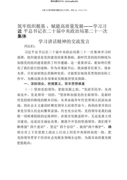 【七哥公文】2025年:【七哥公文】筑牢组织根基,赋能高质量发展——学习习近平总书记在二十届中央政治局第二十一次集体学习讲话精神的交流发言+更多免费公文+VX:QiGeGongWen2024+更多免费公文+VX:QiGeGongWen2024