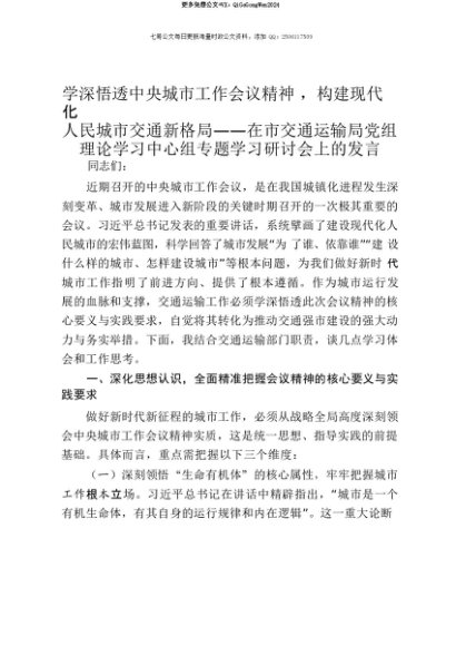 【七哥公文】2025年:【七哥公文】学深悟透中央城市工作会议精神,构建现代化人民城市交通新格局——在市交通运输局党组理论学习中心组专题学习研讨会上的发言+更多免费公文+VX:QiGeGongWen2024+更多免费公文+VX:QiGeGongWen2024