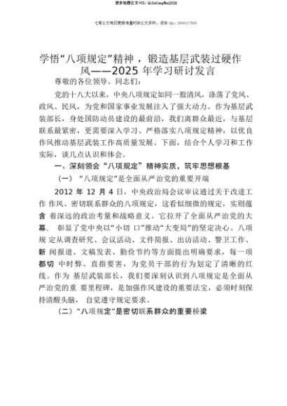 【七哥公文】2025年:【七哥公文】学悟“八项规定”精神,锻造基层武装过硬作风——2025年学习研讨发言+更多免费公文+VX:QiGeGongWen2024+更多免费公文+VX:QiGeGongWen2024