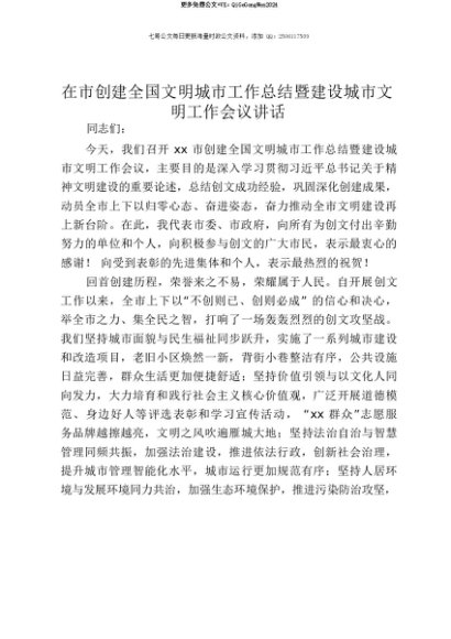 【七哥公文】2025年:【七哥公文】在市创建全国文明城市工作总结暨建设城市文明工作会议讲话+更多免费公文+VX:QiGeGongWen2024+更多免费公文+VX:QiGeGongWen2024