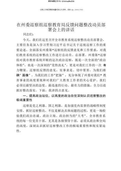【七哥公文】2025年:【七哥公文】在州委巡察组巡察教育局反馈问题整改动员部署会上的讲话+更多免费公文+VX:QiGeGongWen2024+更多免费公文+VX:QiGeGongWen2024