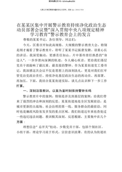 【七哥公文】2025年:【七哥公文】在某某区集中开展警示教育持续净化政治生态动员部署会议暨“深入贯彻中央八项规定精神学习教育”警示教育会上的发言+更多免费公文+VX:QiGeGongWen2024+更多免费公文+VX:QiGeGongWen2024