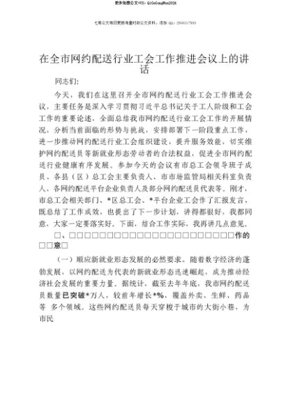 【七哥公文】2025年:【七哥公文】在全市网约配送行业工会工作推进会议上的讲话+更多免费公文+VX:QiGeGongWen2024+更多免费公文+VX:QiGeGongWen2024