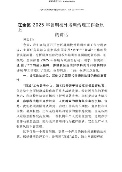 【七哥公文】2025年:【七哥公文】在全区2025年暑期校外培训治理工作会议上的讲话+更多免费公文+VX:QiGeGongWen2024+更多免费公文+VX:QiGeGongWen2024