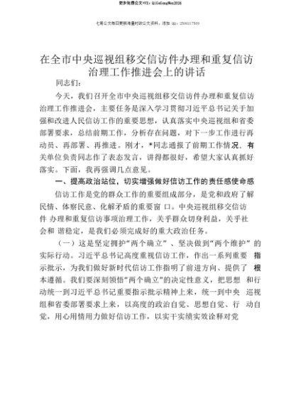 【七哥公文】2025年:【七哥公文】在全市中央巡视组移交信访件办理和重复信访治理工作推进会上的讲话+更多免费公文+VX:QiGeGongWen2024+更多免费公文+VX:QiGeGongWen2024