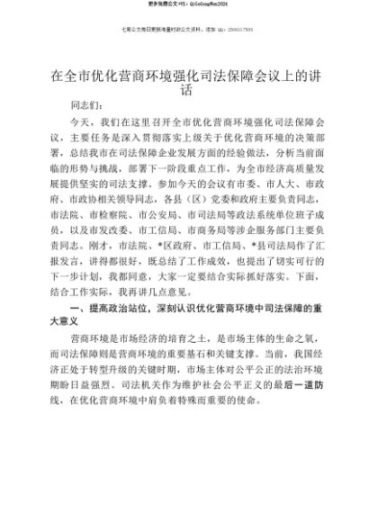 【七哥公文】2025年:【七哥公文】在全市优化营商环境强化司法保障会议上的讲话+更多免费公文+VX:QiGeGongWen2024+更多免费公文+VX:QiGeGongWen2024
