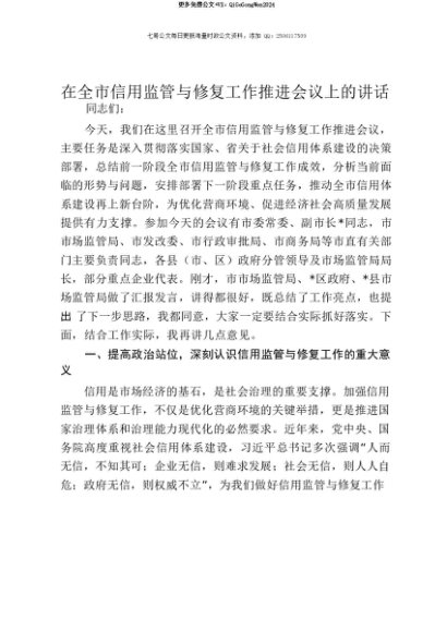 【七哥公文】2025年:【七哥公文】在全市信用监管与修复工作推进会议上的讲话+更多免费公文+VX:QiGeGongWen2024+更多免费公文+VX:QiGeGongWen2024
