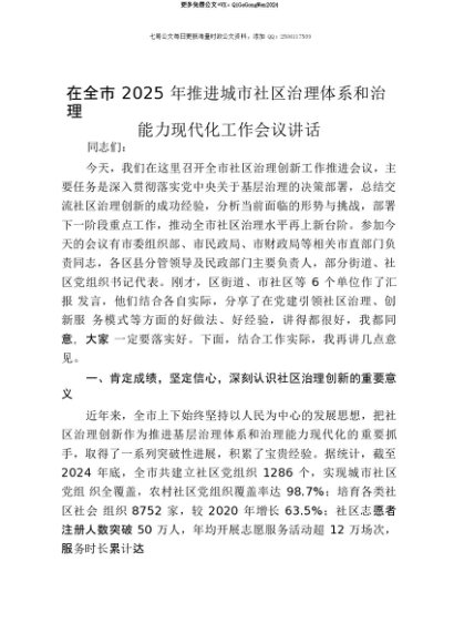 【七哥公文】2025年:【七哥公文】在全市2025年推进城市社区治理体系和治理能力现代化工作会议讲话+更多免费公文+VX:QiGeGongWen2024+更多免费公文+VX:QiGeGongWen2024