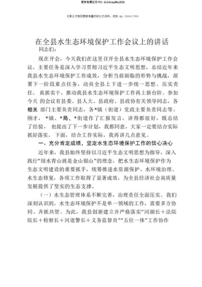 【七哥公文】2025年:【七哥公文】在全县水生态环境保护工作会议上的讲话+更多免费公文+VX:QiGeGongWen2024+更多免费公文+VX:QiGeGongWen2024