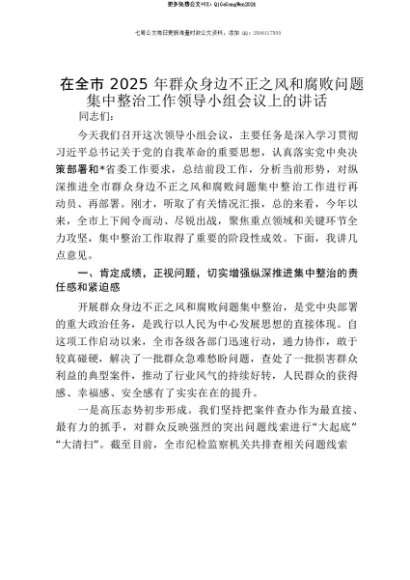 【七哥公文】2025年:【七哥公文】在全市2025年群众身边不正之风和腐败问题集中整治工作领导小组会议上的讲话+更多免费公文+VX:QiGeGongWen2024+更多免费公文+VX:QiGeGongWen2024