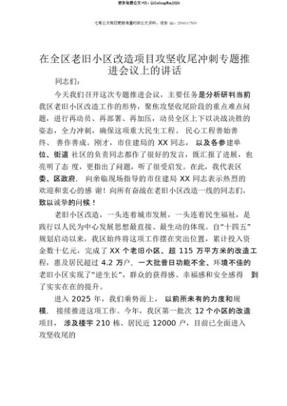 【七哥公文】2025年:【七哥公文】在全区老旧小区改造项目攻坚收尾冲刺专题推进会议上的讲话+更多免费公文+VX:QiGeGongWen2024+更多免费公文+VX:QiGeGongWen2024
