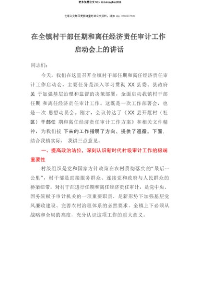 【七哥公文】2025年:【七哥公文】在全镇村干部任期和离任经济责任审计工作启动会上的讲话+更多免费公文+VX:QiGeGongWen2024+更多免费公文+VX:QiGeGongWen2024
