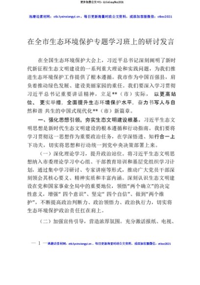 【七哥公文】2025年:【七哥公文】在全市生态环境保护专题学习班上的研讨发言+更多免费公文+VX:QiGeGongWen2024+更多免费公文+VX:QiGeGongWen2024
