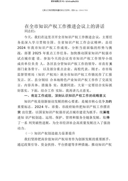 【七哥公文】2025年:【七哥公文】在全市知识产权工作推进会议上的讲话+更多免费公文+VX:QiGeGongWen2024+更多免费公文+VX:QiGeGongWen2024