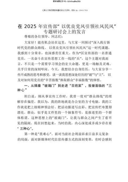 【七哥公文】2025年:【七哥公文】在2025年宣传部“以优良党风引领社风民风”专题研讨会上的发言+更多免费公文+VX:QiGeGongWen2024+更多免费公文+VX:QiGeGongWen2024