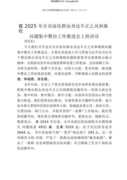 【七哥公文】2025年:【七哥公文】在2025年全市深化群众身边不正之风和腐败问题集中整治工作推进会上的讲话+更多免费公文+VX:QiGeGongWen2024+更多免费公文+VX:QiGeGongWen2024