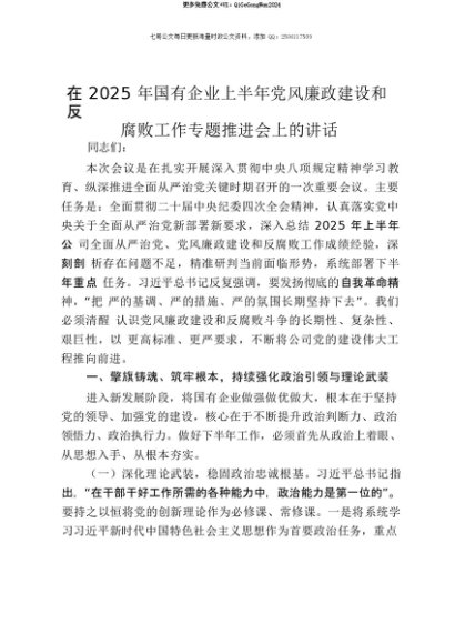 【七哥公文】2025年:【七哥公文】在2025年国有企业上半年党风廉政建设和反腐败工作专题推进会上的讲话+更多免费公文+VX:QiGeGongWen2024+更多免费公文+VX:QiGeGongWen2024