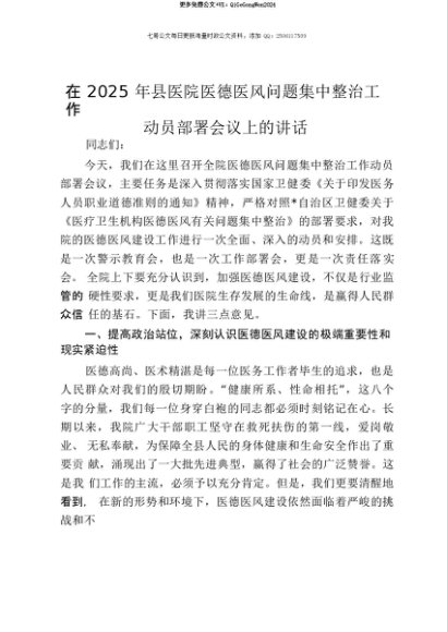 【七哥公文】2025年:【七哥公文】在2025年县医院医德医风问题集中整治工作动员部署会议上的讲话+更多免费公文+VX:QiGeGongWen2024+更多免费公文+VX:QiGeGongWen2024