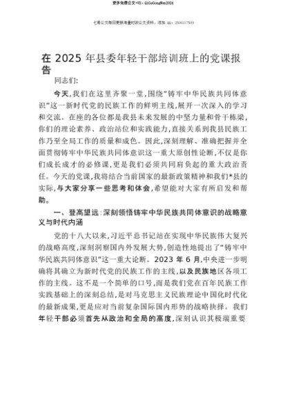 【七哥公文】2025年:【七哥公文】在2025年县委年轻干部培训班上的党课报告+更多免费公文+VX:QiGeGongWen2024+更多免费公文+VX:QiGeGongWen2024