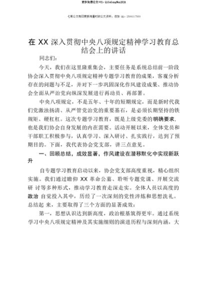 【七哥公文】2025年:【七哥公文】在XX深入贯彻中央八项规定精神学习教育总结会上的讲话+更多免费公文+VX:QiGeGongWen2024+更多免费公文+VX:QiGeGongWen2024
