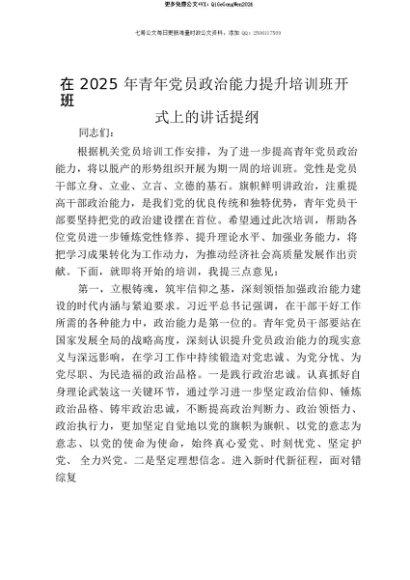 【七哥公文】2025年:【七哥公文】在2025年青年党员政治能力提升培训班开班式上的讲话提纲+更多免费公文+VX:QiGeGongWen2024+更多免费公文+VX:QiGeGongWen2024