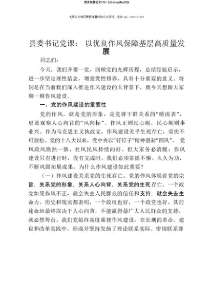 【七哥公文】2025年:【七哥公文】县委书记党课讲稿:以优良作风保障基层高质量发展+更多免费公文+VX:QiGeGongWen2024+更多免费公文+VX:QiGeGongWen2024