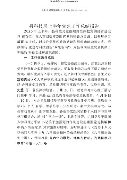 【七哥公文】2025年:【七哥公文】县科技局上半年党建工作总结报告+更多免费公文+VX:QiGeGongWen2024+更多免费公文+VX:QiGeGongWen2024
