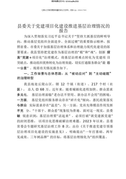 【七哥公文】2025年:【七哥公文】县委关于党建项目化建设推进基层治理情况的报告+更多免费公文+VX:QiGeGongWen2024+更多免费公文+VX:QiGeGongWen2024