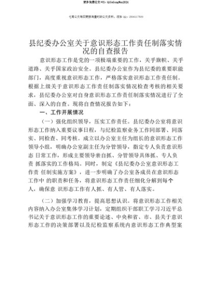 【七哥公文】2025年:【七哥公文】县纪委办公室关于意识形态工作责任制落实情况的自查报告+更多免费公文+VX:QiGeGongWen2024+更多免费公文+VX:QiGeGongWen2024