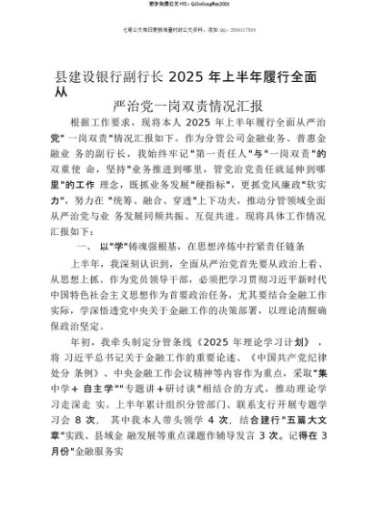 【七哥公文】2025年:【七哥公文】县建设银行副行长2025年上半年履行全面从严治党一岗双责情况汇报+更多免费公文+VX:QiGeGongWen2024+更多免费公文+VX:QiGeGongWen2024