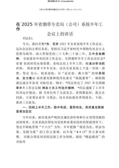 【七哥公文】2025年:【七哥公文】在2025年省烟草专卖局(公司)系统半年工作会议上的讲话+更多免费公文+VX:QiGeGongWen2024+更多免费公文+VX:QiGeGongWen2024