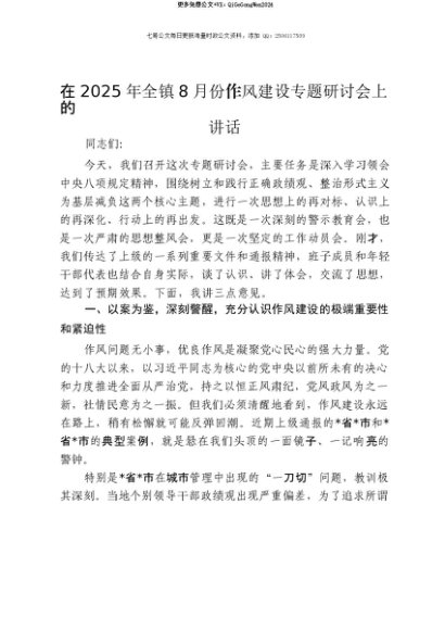 【七哥公文】2025年:【七哥公文】在2025年全镇8月份作风建设专题研讨会上的讲话+更多免费公文+VX:QiGeGongWen2024+更多免费公文+VX:QiGeGongWen2024